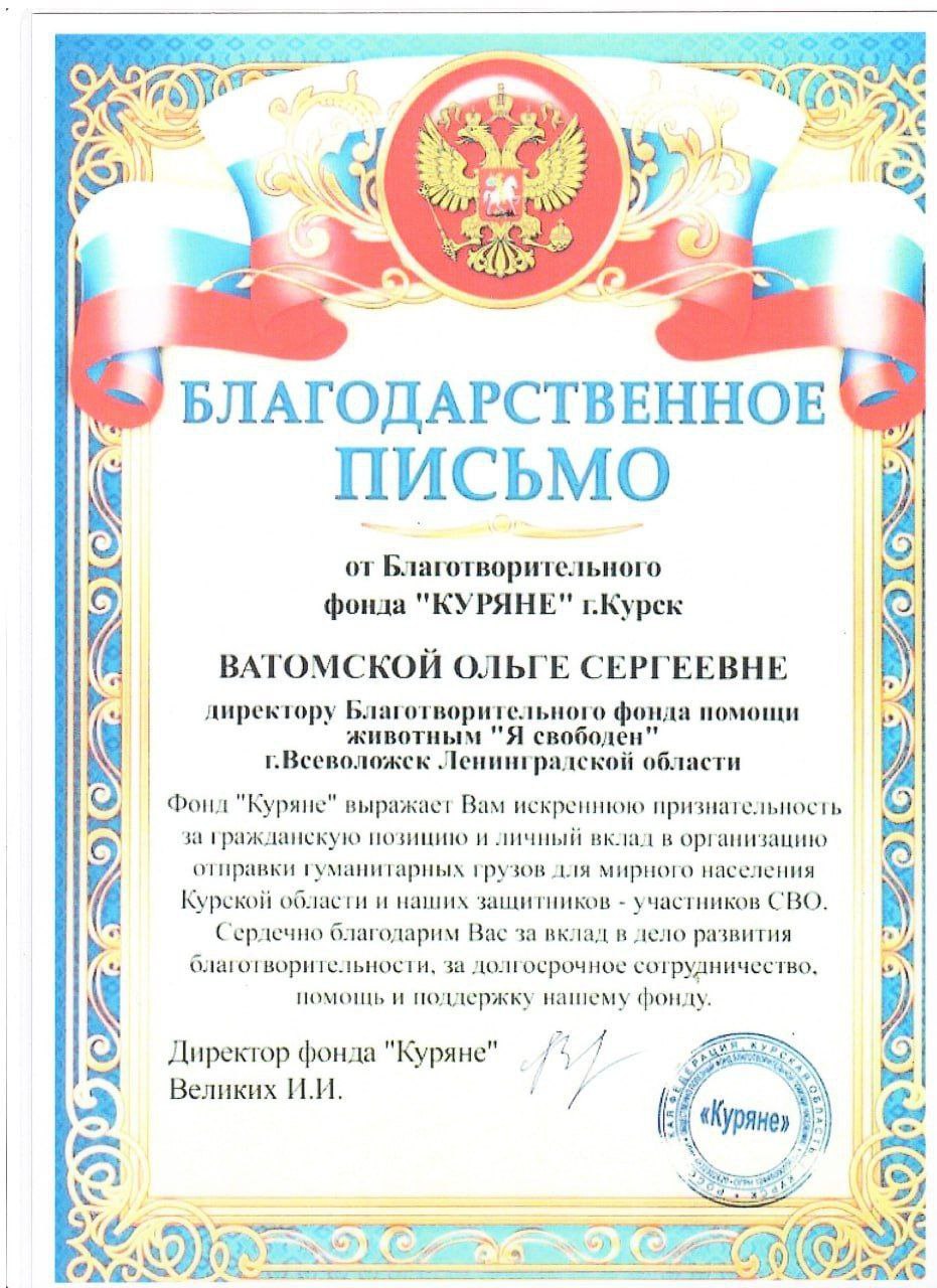 - Благодарность от благотворительного фонда "Куряне"